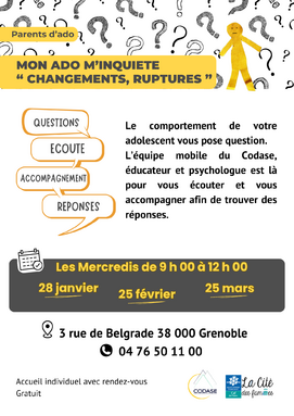 Par admin pablo-neruda, publié le jeudi 8 janvier 2026 07:41 - Mis à jour le jeudi 8 janvier 2026 07:41La Cité des Familles de Grenoble, en partenariat avec le CODASE, propose des permanences mensuelles gratuites pour les parents d'adolescents. -