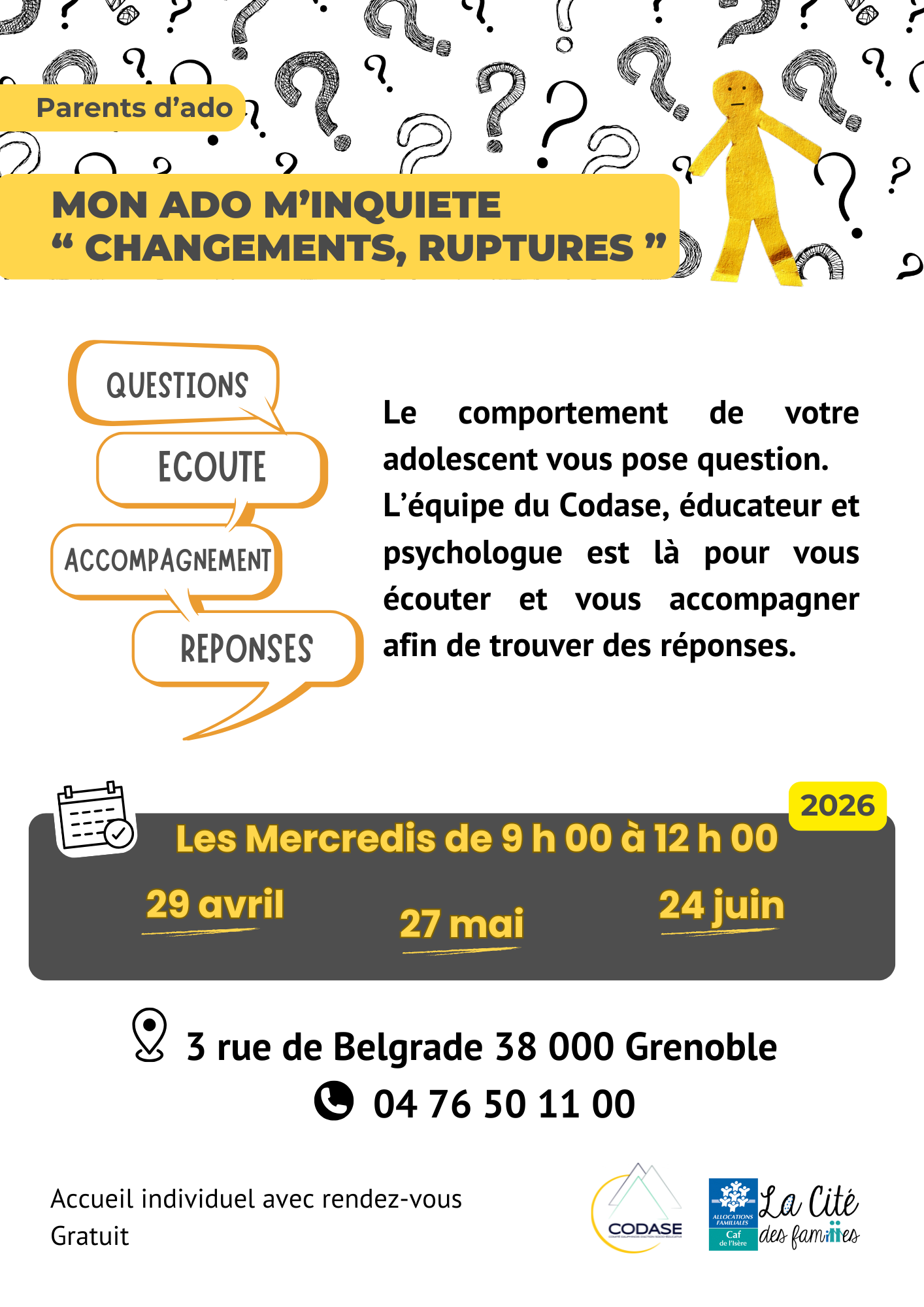 La Cité des Familles de Grenoble, en partenariat avec le CODASE, propose des permanences mensuelles gratuites pour les parents d'adolescents.