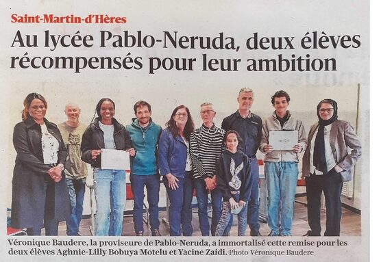 Par admin pablo-neruda, publié le vendredi 27 mars 2026 22:29 - Mis à jour le vendredi 27 mars 2026 22:29Ce vendredi 14 février 2025, deux de nos élèves de Terminale STI2D, Cyprien LUCIANI et Jeffrey NZUZI MBAMU, ont reçu la bourse pour l'ascenseur social de la Fondation Anny et Henri MARCHETTA, remise par les ambassadeurs de la fondation.